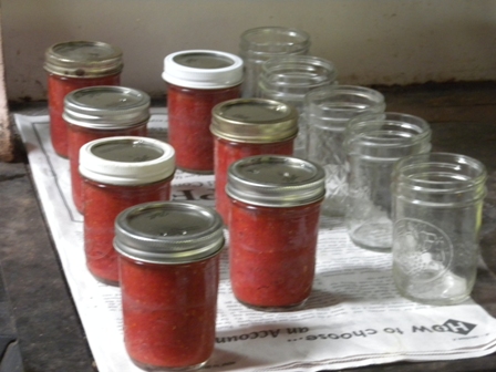 From the Kitchen. Preserving food is the focus here. Even though it was hot we had the stove going. As mentioned above, I canned the last of the yellow transparent apples as applesauce. And tomatoes and chestnut crab apples in the form of juice. My first try at tomato paste was a success.